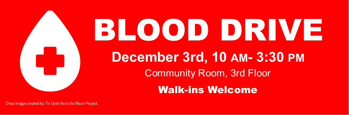 Blood Drive 12/3/16 10 AM to 3:30 PM, library Community Room 3rd Floor, Walk-ins Welcome