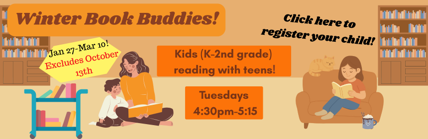 Winter Book Buddies! January 5, 2026 MPL Thursdays at 4:30, starting January 27th Garden View Room, 1st Floor Read more Programs Teen Programs Youth Programs