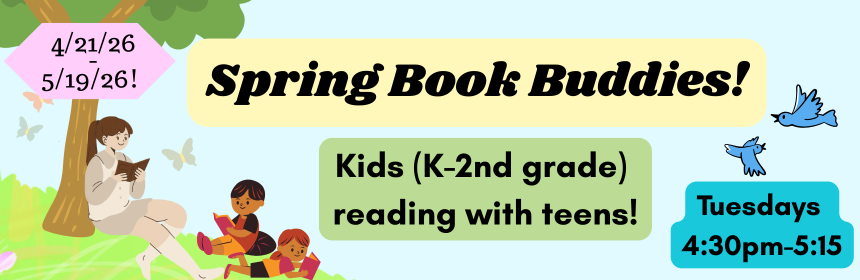 Spring Book Buddies! April 5, 2026 MPL Tuesdays at 4:30pm, starting April 21st Garden View Room, 1st Floor Read more Programs Teen Programs Youth Programs
